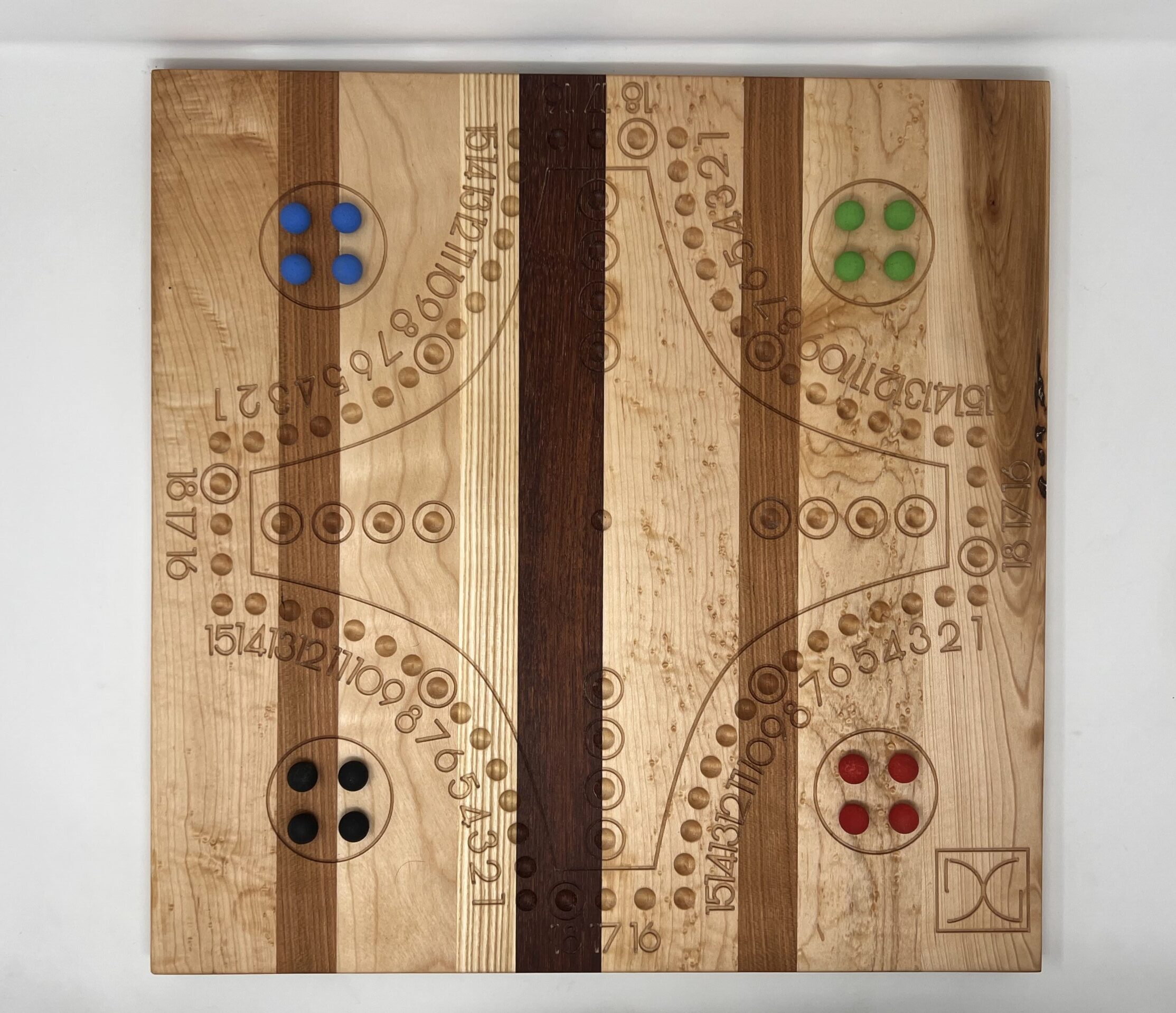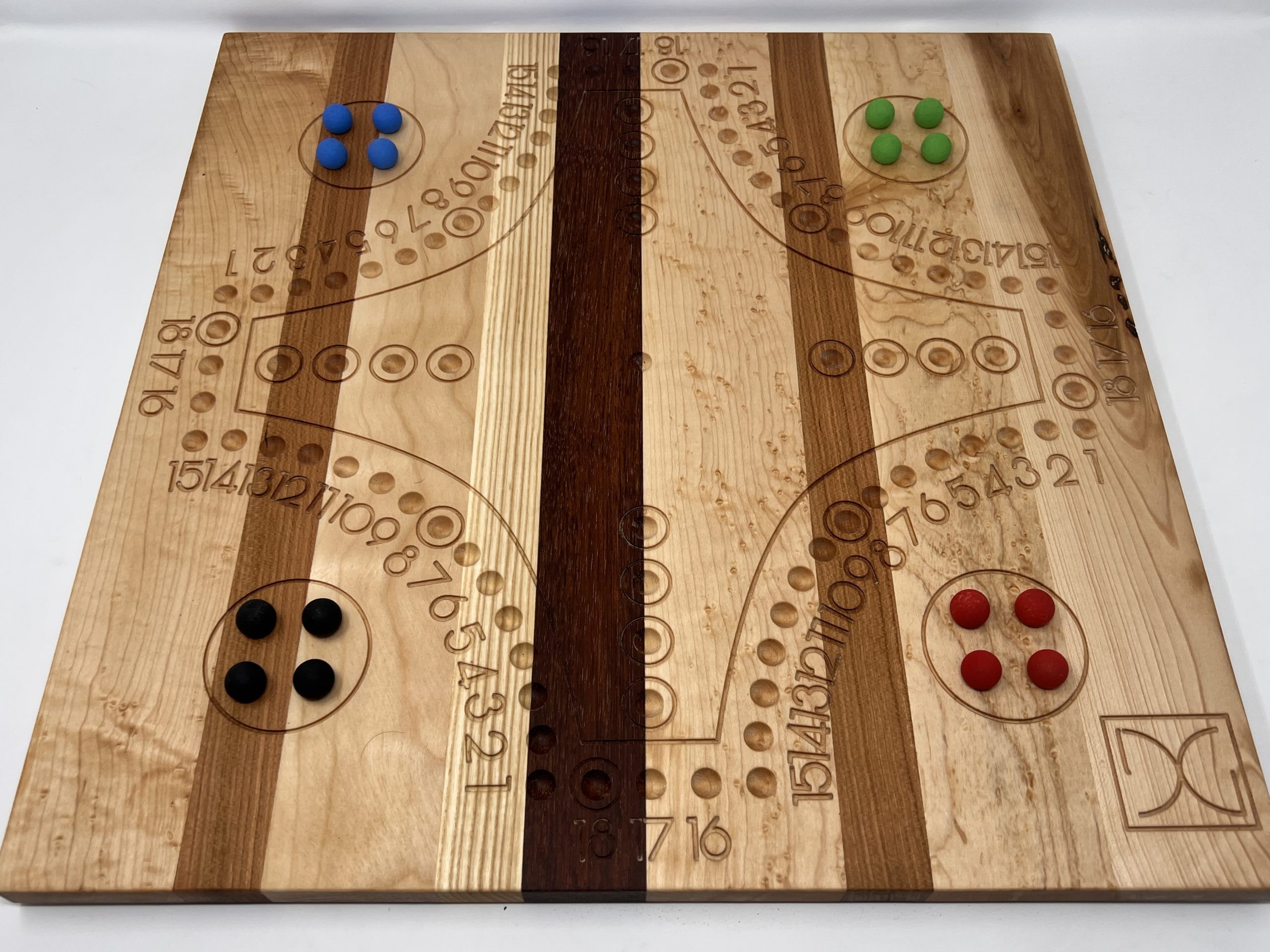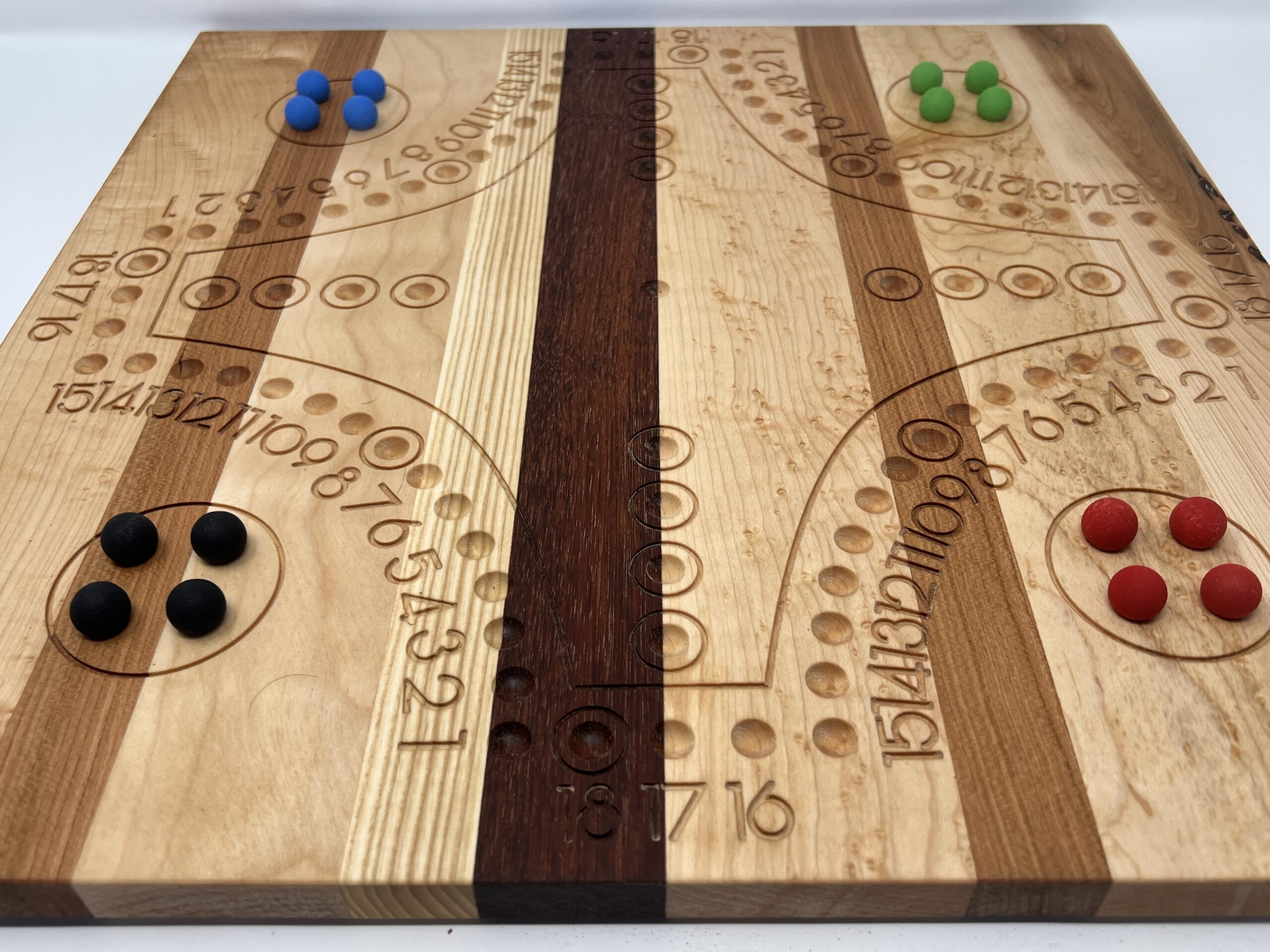 Il s'agit d'un plateau de Tock en bois massif pour 4 joueurs de 18″ x 18″ x 3/4″ fabriqué à partir de (de gauche à droite) : érable moucheté, cerisier, érable, frêne, jatoba, érable moucheté, cerisier, érable moucheté et érable.